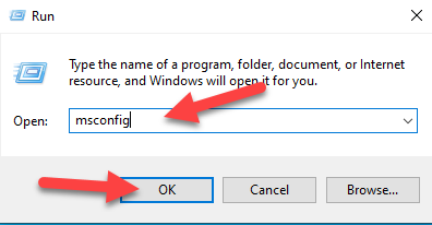 - Tapez « MSConfig » dans la boîte de dialogue » Exécuter » et appuyez sur ok.